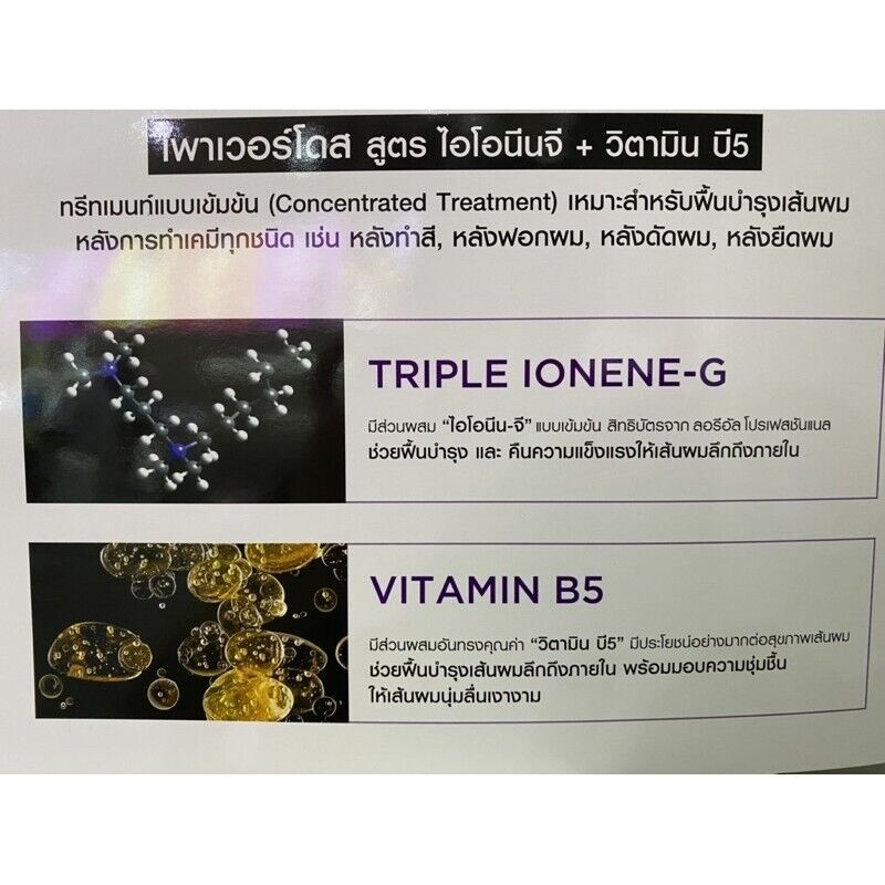 Hair treatment for one time use Combining valuable ingredients "Ionine G" and "Vitamin B5" suitable for rejuvenation. Restore strength to the hair to the inside and restore moisture to dry and damaged hair After hair coloring, bleaching, curling, straightening, the hair will come back to look softer, healthier and more shiny.