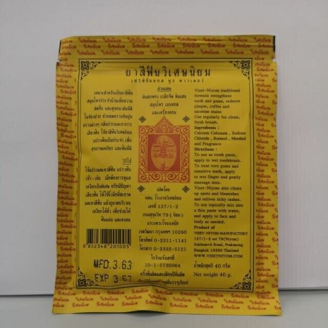 Viset-Niyom Traditional Formula Strengthens teeth and gums, reduces plaque, coffee and nicotine stains.