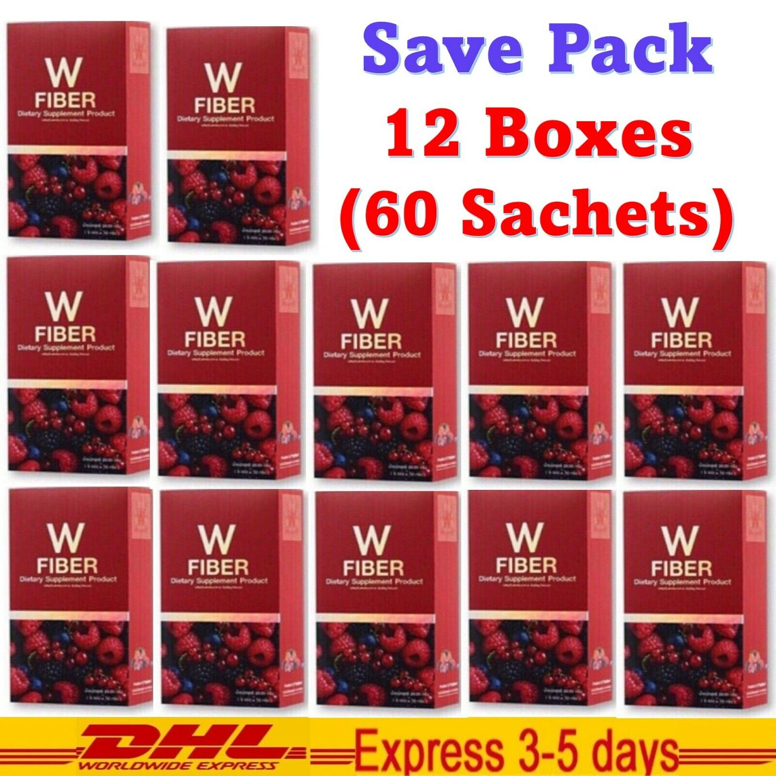**** Excluding Remote Area Surcharge **** Description Condition : New 100% Size : 1 Box / 5 Sachets Quantity : 12 Boxes / Set W fiber Control weight, Adjust excretion system, Punch flavor delicious W fiber, dietary fibers balance excretion system using selected berry fruits extracts which the production process has been certified by GMP HACCP. Its safety is guaranteed by Thailand FDA. The product helps to excrete easily, no twist pain, sleep well, detoxification, have clear belly by premium grade extracts 1. Raspberry extract : helps excretion and anti-oxidant 2. Cranberry extract : contains high Vitamin C, E and high fiber 3. Citrus Sinensis extract : breaks down belly fat 4. Black current extract : strengthen tissue and stimulate immune 5. Gold kiwi powder : helps excretion and prevent constipation 6. Garcinia extract : pulls accumulated fat to be used as energy 7. Apple extract : helps in body detoxification 8. Emblica extract : decreases accumulated fat and cholesterol 9. Guar Gum : increases fiber in digestive system 10. L-carnitine : burns fat and decreases cholesterol 11. Chitosan : traps lipid inhibiting its absorption 12. Psylium Husk Powder : detoxify waste and excretes accumulated toxic substances from digestive system 13. Fructo oligosaccharide : gives sweetness instead of sugar and helps to be full longer 14. Oat powder : high fiber helps to feel full fast 15. Wheat extract : high fiber helps in excretion How to drink - Tear off the sachet, brew with water at normal temperature and stir until dissolved in water- - 1 sachet daily (150 grams of water) - The eating period is before bedtime or at 20:00 hrs. For people with severe constipation, difficult to take, it is recommended to take 7 days in a row, then reduce to 3 times a week, 1 time per week, 1 time per month.g. Caution : - Children, pregnant women, and women breast-feeding should not eat. - Should eat a variety of all 5 group in the right proportions on a regular basis. - No the prevention and treatment of disease. Results may vary depending on the individual. Our Policy: Customs Duty fees & Import