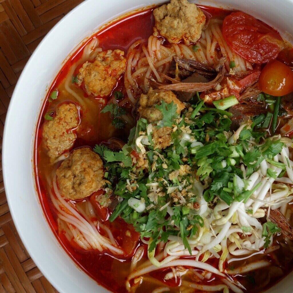 3. Serve with rice nodle , sprinkle with bean sprouts , coriander leaves and onion on top.