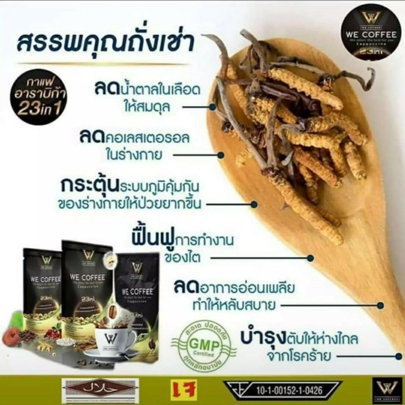We coffee Herbal coffee, Ginseng, Ganoderma lucidum, Goji berry, Tangkui, Moringa, Krachai black, Baqui leaves and other herbs, total 23 species, suitable for those who want to take care of their health,.